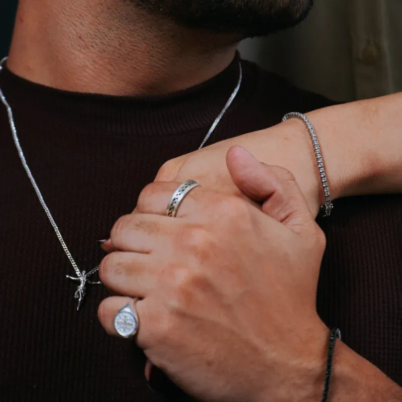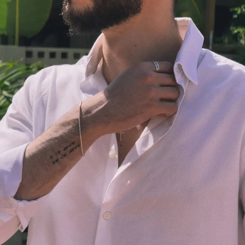 O Luca reúne três peças que se completam sem se disputar. O fio preto fino traz leveza, a pulseira cadeado em prata adiciona textura e personalidade, e a medalha de São Bento — com suas pedras negras - ancora o conjunto em algo maior do que a estética.